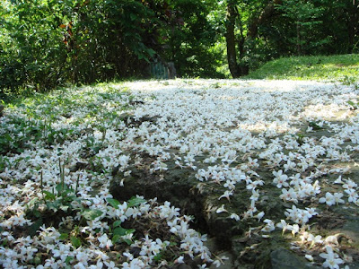從勞工育樂中心旁的步道上山,沿途花木扶疏,緩坡上走不久可見步道上遍地桐花雪。滿樹的桐花煞是好看,但是更美的、更詩情畫意的應該是桐花隨風飄落的剎那。當清風襲來,風吹樹動沙沙聲伴隨著滿天飄落的桐花,快樂指數頓時直上雲霄。